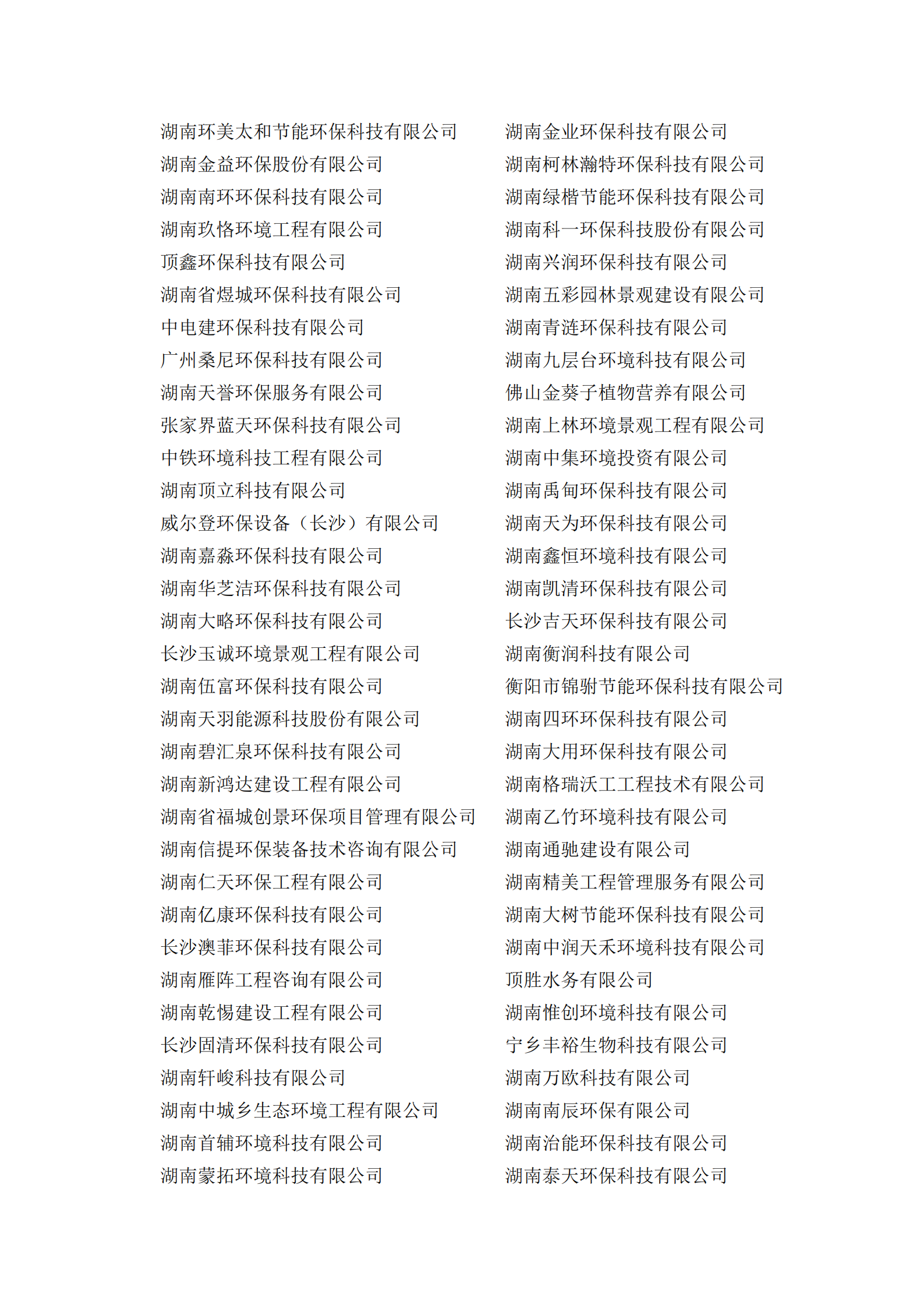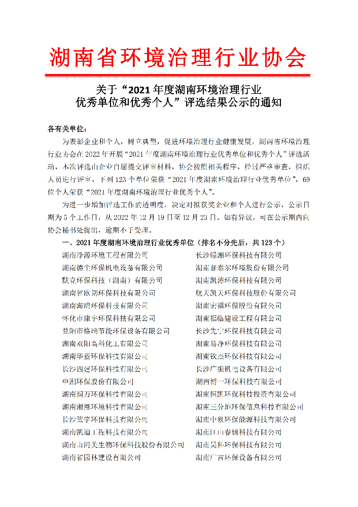 为表彰企业和个人,树立典型,促进环境治理行业健康发展,湖南省环境治理 行业协会在 2022 年开展“2021 年度湖南环境治理行业优秀单位和优秀个人”评选活 动,本次评选由企业自愿提交评审材料,协会按照相关程序,经过严格审查,组织 人员进行评审,下列 123 个单位荣获“2021 年度湖南环境治理行业优秀单位”,69 位个人荣获“2021 年度湖南环境治理行业优秀个人”。 为进一步增加评选工作的透明度,决定对拟获奖企业和个人进行公示,公示日 期为 5 个工作日,从 2022 年 12 月 19 日至 12 月 23 日。如有异议,可在公示期内向 协会秘书处提出,逾期不予受理。
